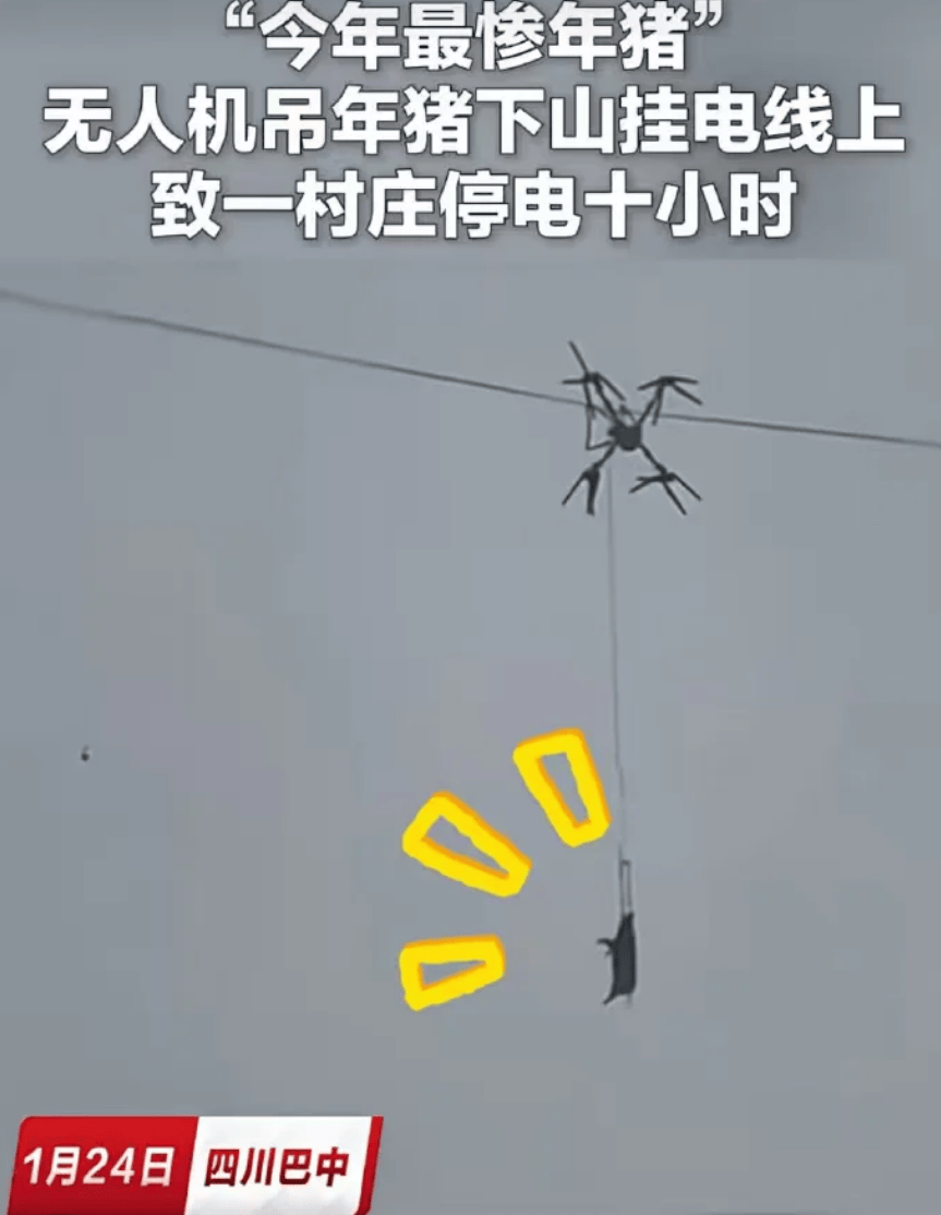 在使用无人机吊运二师兄的过程中,开局不利,第一头猪直接就给挂在了电线上,知情人称,现场人员曾多次尝试处置和救援均未成功。