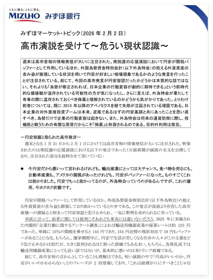 而瑞穗银行会公开向马上就要迎来关键选举的高市早苗叫板,是因为高市在2月初就日元贬值问题发表的一番讲话,让该银行感到了深深的“焦虑”。