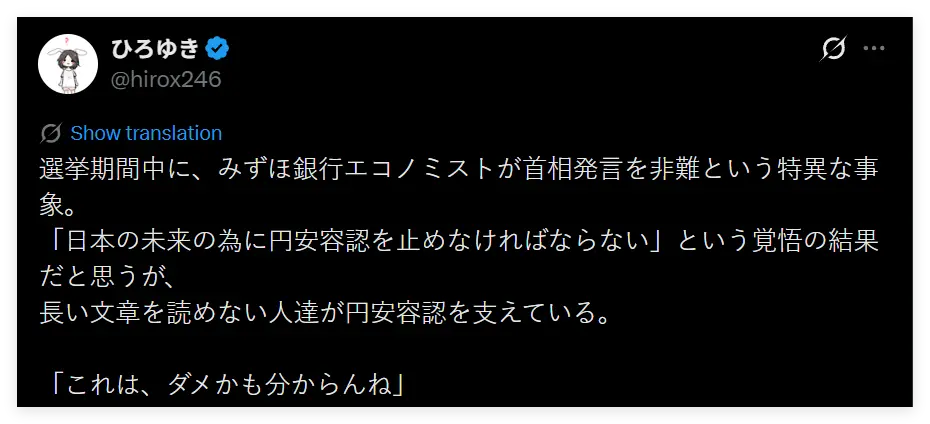 而本身就反对日元贬值,认为这对日本经济没有好处的西村,更是在转发瑞穗的分析时讽刺说,可惜那些高市的支持者看不懂这种长篇的专业分析。