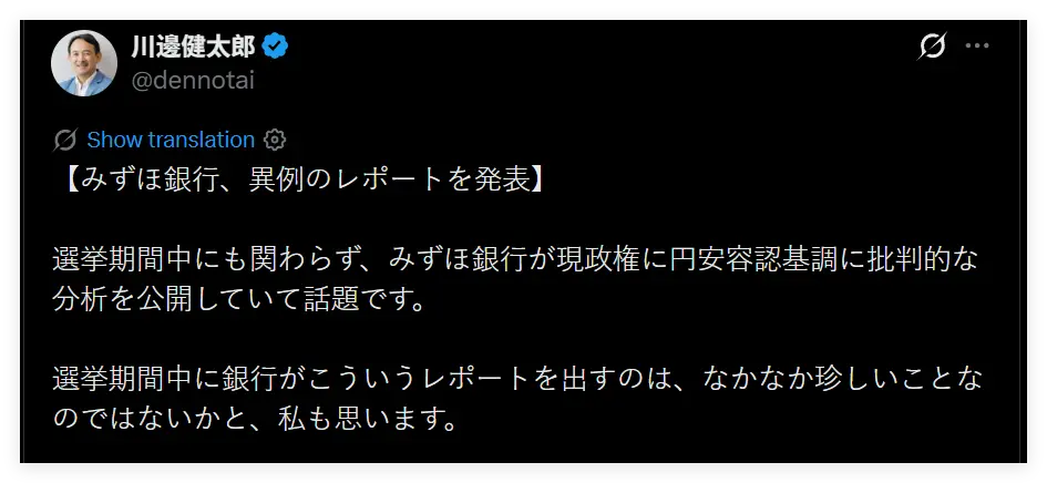 目前,瑞穗的这一分析已经在日本社交网络上获得了拥有13万粉丝的雅虎日本公司前总裁川边健太郎,以及拥有260万粉丝的日本知名网红西村博之等人的关注和转发。两人都认为瑞穗在日本众议院选举马上就要开始时突然在经济政策上批评高市,是“很罕见的”。川边还认为,这说明日本金融界对高市是心存担忧的。