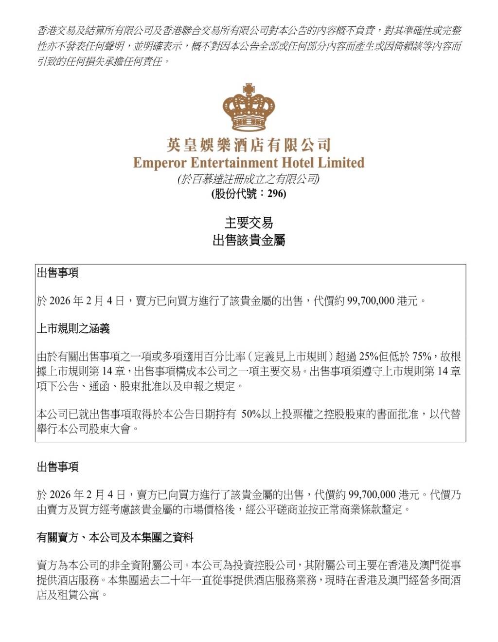 2月4日晚间,英皇娱乐酒店发布公告称,于当日公司的非全资附属公司Right Achieve Limited(正成有限公司)已向买房贺利氏金属香港(专题)有限公司进行了该贵金属的出售,代价约9970万港元,而被出售的贵金属为合计重达79公斤的多块金砖。