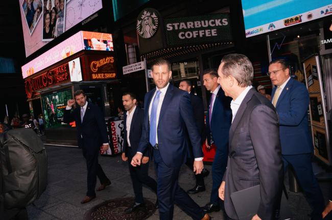 8月,埃里克·川普走在时代广场的纳斯达克大楼前。图片来源:PAOLA CHAPDELAINE FOR WSJ