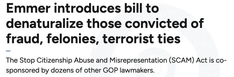 近日,共和党议员还提出一项法案,允许政府剥夺任何在入籍后十年内犯下重罪、欺诈政府或加入恐怖组织的人的美国公民身份。