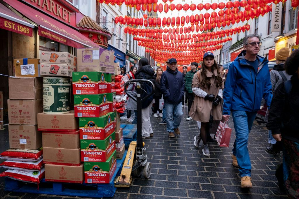 图为2024年2月9日在英国伦敦唐人街上,商家和民众为农历新年庆典做准备。(Getty Images)