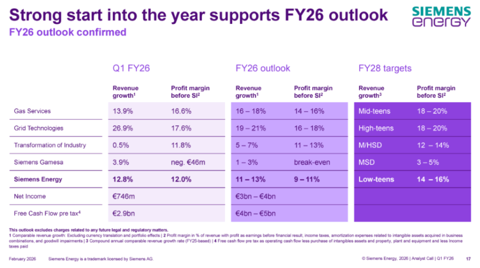 德国能源设备供应商西门子能源公司近日披露的2026年第一财季(2025年10月-12月)数据延续强劲势头,净利润从上年同期的2.52亿欧元大幅攀升至7.46亿欧元;得益于燃气轮机和电网设备需求持续旺盛,该公司本财季的订单额大增34%至176.09亿欧元,使得积压订单达到创纪录的1460亿欧元;利润(扣除特殊项目前)同比增长141%,对应利润率从5.4%扩大到12.0%;税前自由现金流激增87.8%。