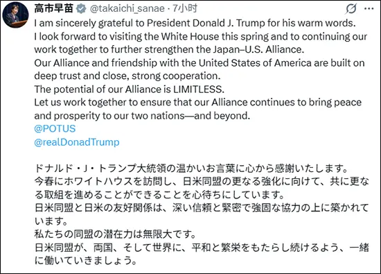 2月8日日本眾議院選舉獲勝後,高市早苗深夜在X平台上用日、英雙語發文,對美國總統特朗普早前的發聲表示感謝。