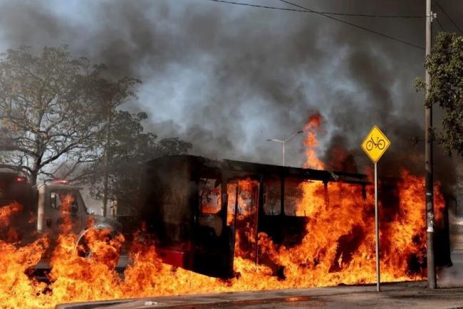·2026年2月,一辆被贩毒集团点燃的墨西哥公交车。(盖蒂图片社)