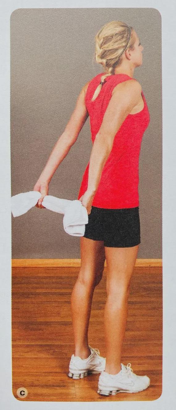 (?? 握著毛巾兩只手之間的寬度,根據自己的柔韌度來安排,讓自己的胸、肩盡量伸展,同時不會有明顯不適感的程度就可以了。)