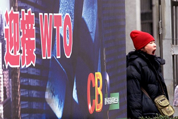 图为中国在2001年加入世界贸易组织时,大陆街头的各式宣传展板。(Goh Chai Hin/AFP/Getty Images)