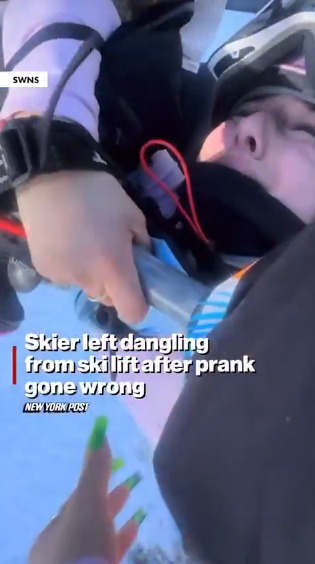 《纽约邮报》最新上传的视频,称这名女子疑似玩恶作剧出了大岔子,结果滑落缆车,被困在离地65英尺(约20米)高的滑雪缆车上。视频中可以听到这名女子大声呼叫同伴:“拉我起来。”