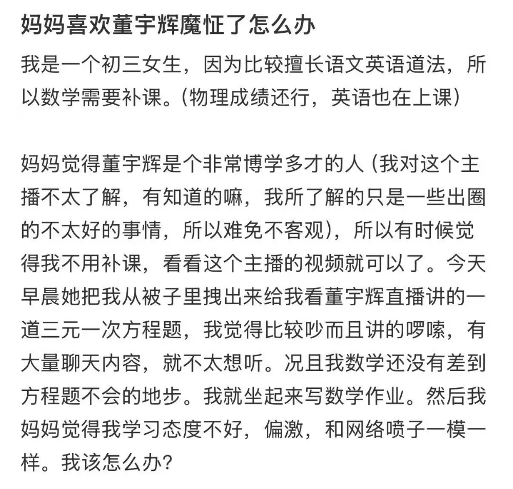 一位初三学生困惑发帖,诉说母亲痴迷董宇辉到魔怔的地步,会在大清早将她从被窝里拉起,只为一起听董宇辉讲解三元一次方程。