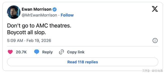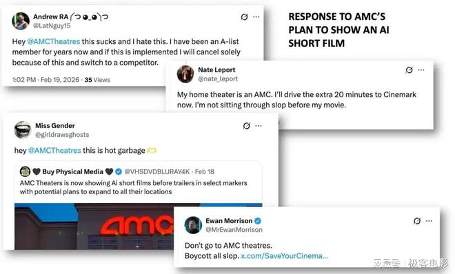 舆论的矛头,很快便集中指向了提供放映场所的AMC院线。尽管从技术上讲,安排放映的是广告公司Screenvision Media,但作为美国最大的院线,AMC成为了这场抵制AI运动最方便的靶心。