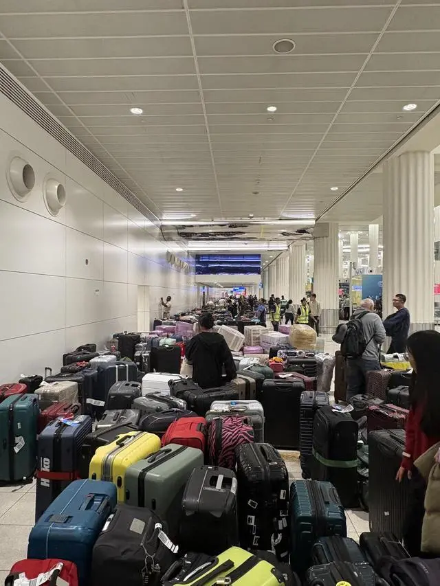 2月28日王先生滞留机场时拍摄的照片,满地是旅客的行李箱 受访者供图