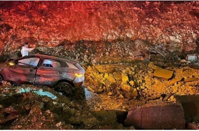 飞弹轰炸地面成坑洞,这辆比亚迪电动车居然灯号还在闪烁。(翻摄以色列时报)