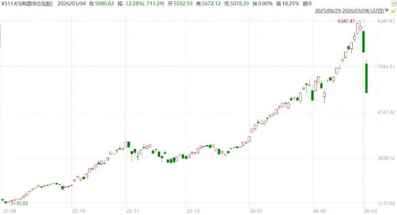 對油價通脹沖擊的擔憂正在終結亞洲AI交易的狂歡,海外資金加速撤離,韓國股市首當其沖。周叁,韓國綜合指數壹度暴跌逾12%,並觸發熔斷,交易暫停20分鍾。兩日累計跌幅擴大至20%,抹去2月份全部漲幅,創下2008年以來最慘烈的兩日跌幅紀錄。