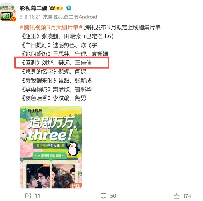 不仅如此,眼下又有一部新剧传来好消息,《叵测》进入到鹅厂3月拟定上线剧集片单。