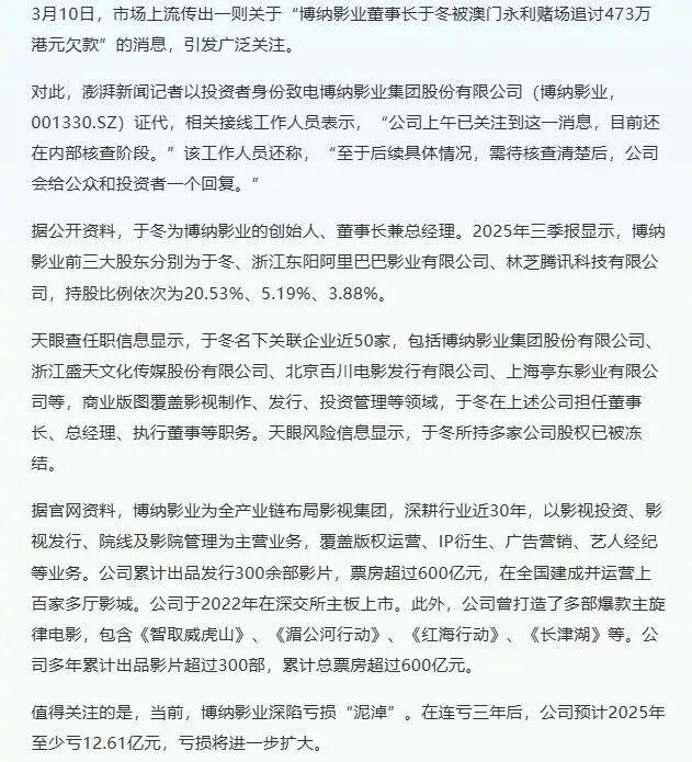10日,澎湃新聞記者以投資者身份致電博納影業集團股份有限公司(博納影業,001330.SZ)證代,詢問於冬被曝欠賭債未還,接線工作人員:“公司上午已關注到這壹消息,目前還在內部核查階段。”“至於後續具體情況,需待核查清楚後,公司會給公眾和投資者壹個回復。”