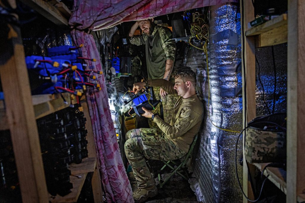 去年,在哈爾科夫地區,烏克蘭士兵在掩體裡制造無人機。 David Guttenfelder/The New York Times