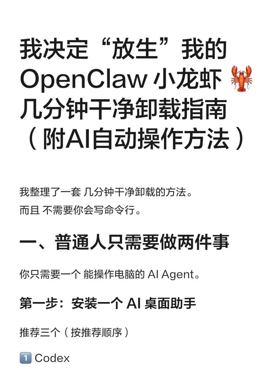 王劲发布了一条如何“安全、彻底卸载龙虾详细步骤”的帖子。但王劲也知道,这份卸载攻略,短期内都不会获得太多关注和追捧,因为对于任何AI工具而言,风险和危害真正暴露,或许也需要几周乃至几个月的时间。