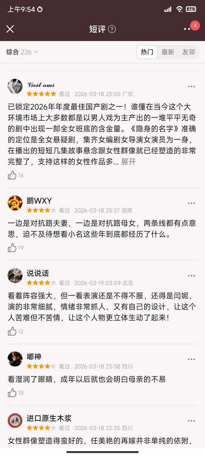 总的来说,《隐身的名字》是一次悬疑剧的创新尝试,它不靠猎奇吸睛,而以现实为锚点,以人性为切口。它拒绝悬浮的“伪悬疑”,坚持让悬疑成为一面镜子,映照出家庭关系中的权力褶皱、代际沟通里的信任断层、以及中年女性在多重身份夹缝中的精神困局,值得一看。