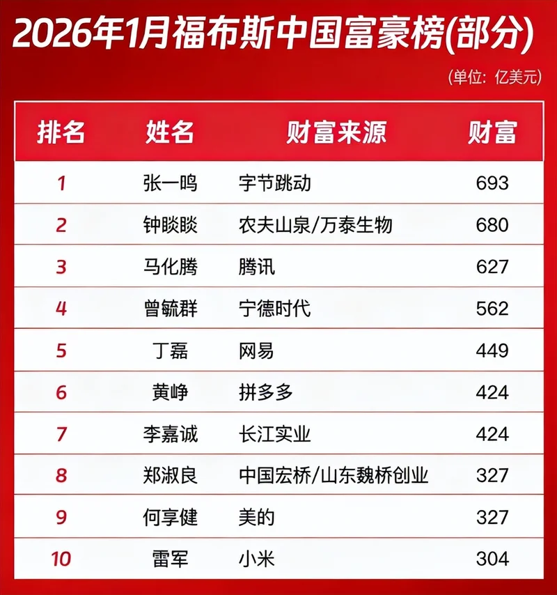 2026年伊始,福布斯富豪榜再度更新。