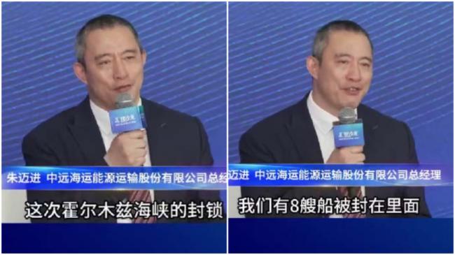 2026年3月21日,中远海运总经理受访时承认8艘船被困波斯湾。(视频截图)