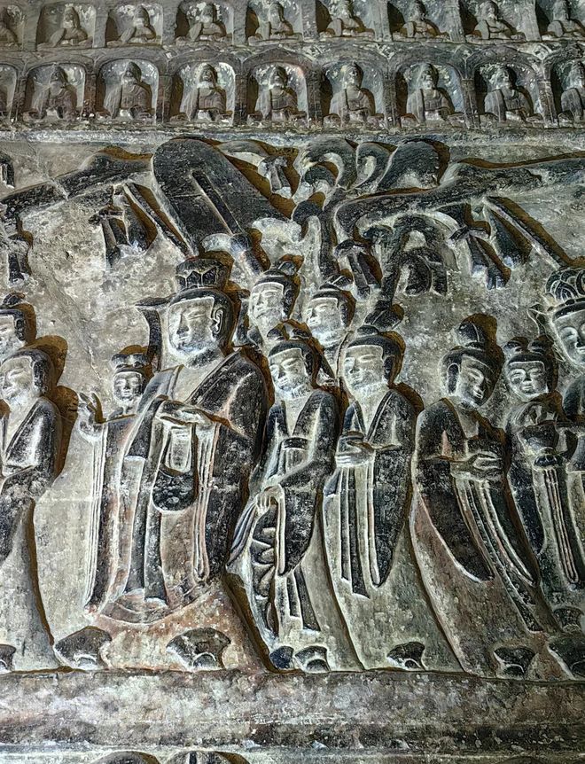 已经适应了农耕生产生活方式的鲜卑等游牧民族,也在自觉或不自觉地采用汉服,因为无论是款式还是质地,相比他们的传统服装要舒适太多,也更符合新的生活方式。北魏孝文帝汉化改革,于公元486年前后颁布《服制令》,明确要求“罢鲜卑旧服,改穿汉装”,参照汉魏衣冠制度。洛阳龙门石窟宾阳中洞的《帝后礼佛图》中,孝文帝与文昭皇后均着宽袍大袖的汉族冠服,衣襟为典型的右衽。太子元恂因抵制改革、坚持“编发左衽”而被废黜,可见衣襟方向已关乎政治立场。