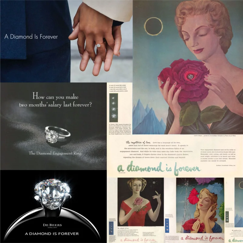 19世纪下半叶,南非发现了储量巨大的钻石矿,产能以吨计算。按照正常的供需关系,钻石本该卖成普通矿石的价格。但一家叫戴比尔斯的公司把矿买了,然后做了两件事:控制出货量,人为制造稀缺;砸钱做营销,想出了那句传遍全球的广告语,“钻石恒久远,一颗永流传”。