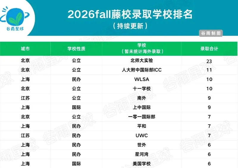 今年北京学校一洗早申时候的雪耻,常年在第一位的北师大实验国际部,今年又拿下23枚藤校录取,还不含哥大双学位。我们也采访过不少北师大实验的孩子,都很特别。排在第二位的人大附中拿下11枚,上海WLSA排在第三名,拿下10枚,和北京十一学校并列,民办学校第一。