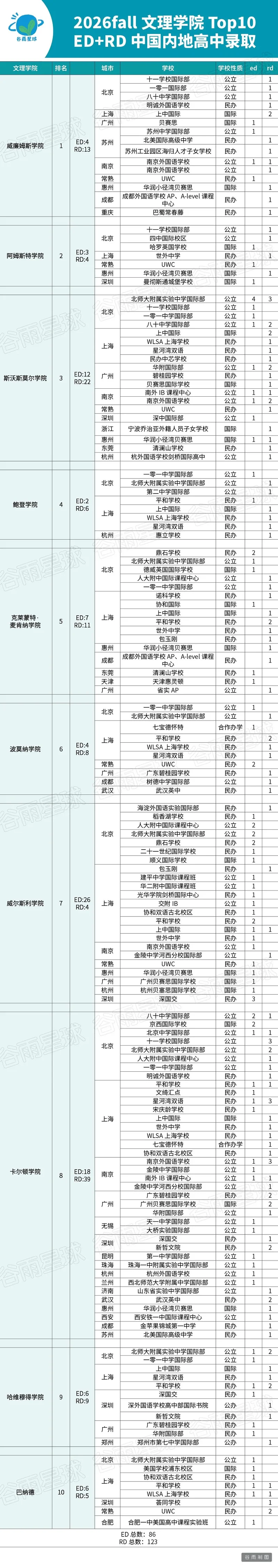 北京(28.7%)和上海(28.2%)双足鼎立,合计将近六成,这个格局和藤校几乎一模一样,国际教育的顶端资源,始终高度集中在这两座城市。但文理学院的城市版图还是比藤校更分散一些,因为文理学院更喜欢「独特」,今年南京占比8.6%,超过广州(7.7%)和深圳(5.7%),而这一结果几乎全靠一所学校撑起来:南京外国语学校。对于文理学院的招生来说,看的的契合,尤其是学生的在热爱上的专注和人文素养。我也认识有的学生能爬藤却只申请了文理学院,正是看重了其本质。我们也写过文理学院的核心价值**文理学院毁了孩子的四年?!任教几十年教授看见中国学生的接轨与断层