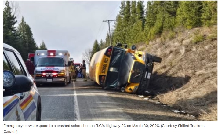 (加西网简讯) 周一,BC内陆地区发生一起校车事故,一辆校车翻入沟渠,造成包括儿童在内的三人受伤。