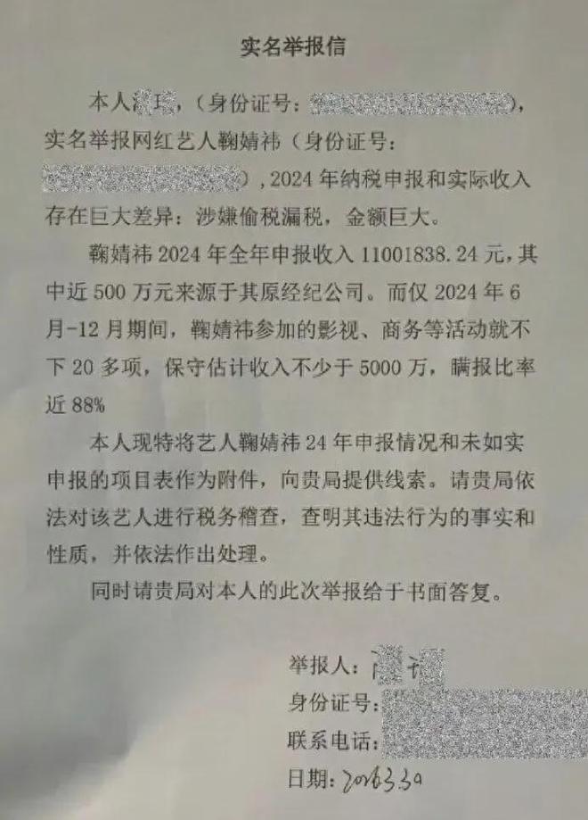其中最显眼的一张图,是上海税务局开具的《检举税收违法行为接收回执》,编号2026-013,盖着税务机关的大红章,检举对象——鞠婧祎。举报人名字被打了马赛克,但稍微有点记性的人,都知道这是谁的手笔——丝芭早在2025年底就公开声明,要把鞠婧祎和关联人涂某某涉嫌严重经济犯罪的行为,进行全网实名举报。