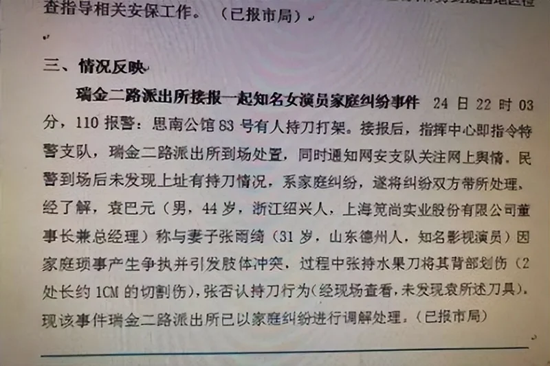 夫妻俩因生活琐事发生肢体冲突,过程中张雨绮疑似持水果刀将丈夫背部划伤(1cm的伤口)。