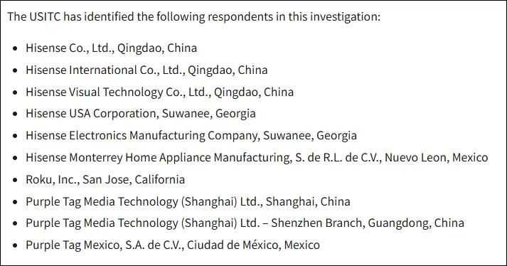海信集團旗下多家海內外公司、美國Roku、中國上海六科多媒體及其關聯公司被列為列名被告。