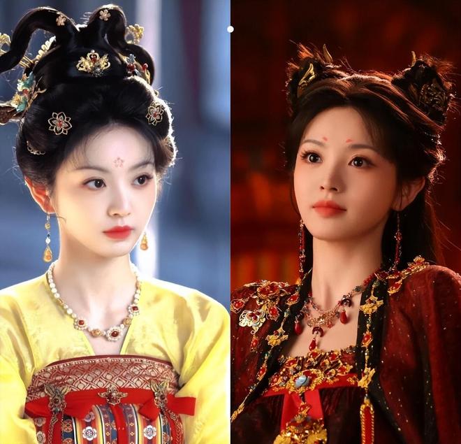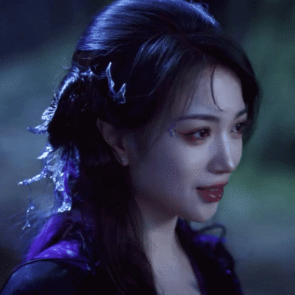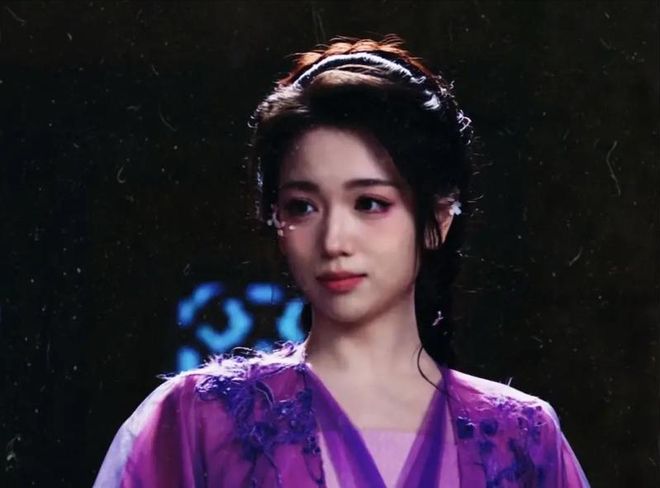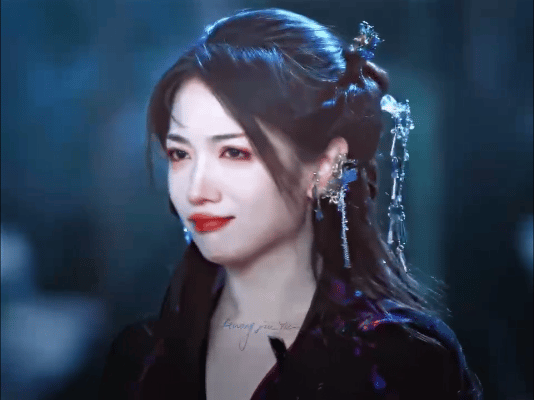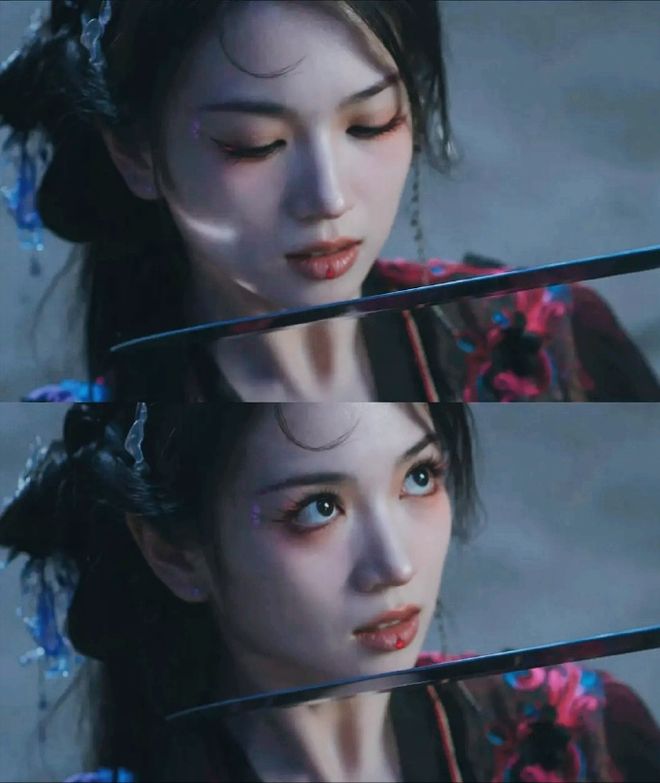 此外,她的“妖女”造型也相當能打,她身著紫黑長裙現身,青絲半垂搭配朱釵、月牙花鈿等古風元素,尤其是下唇中央的壹顆紅色鑽飾,強化了“蛇蠍美人”氣質,極具辨識度和視覺沖擊力。