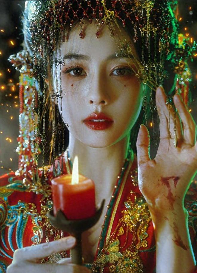 她的紅衣女鬼新娘造型看似高貴清冷,實則眼含怨念與慘烈、陰鷙與詭譎,令人看壹眼就覺背脊發涼、不寒而栗。