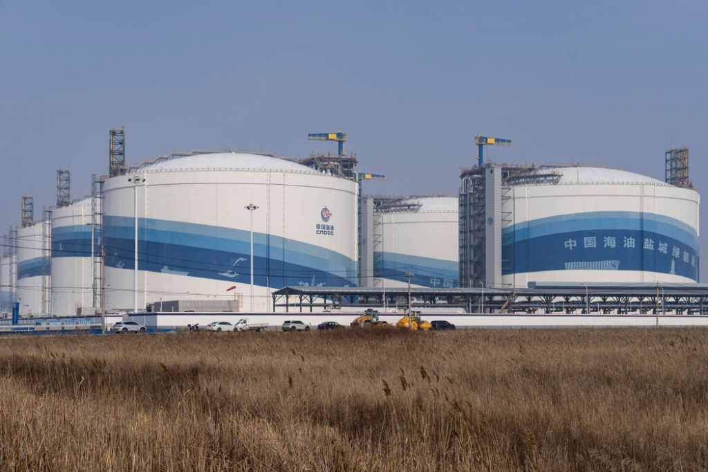 在工业港口盐城的六座储罐中,每一座都储存着足以满足北京2200万人口两个多月的家庭用气需求。旁边还有另外四个梯级略小的储罐。