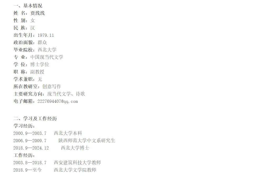 据西北大学文学院官网,贾浅浅自2018年9月任职于西北大学文学院,现为西北大学文学院副教授,主要研究方向为现当代文学、诗歌。教师简历显示,其近年来主要科研成果包含11篇论文、2篇着作、1项课题,并于2017年12月获第二届陕西青年文学奖,诗歌奖。而上述科研成果中,大多与其父亲贾平凹相关作品的研究有关。