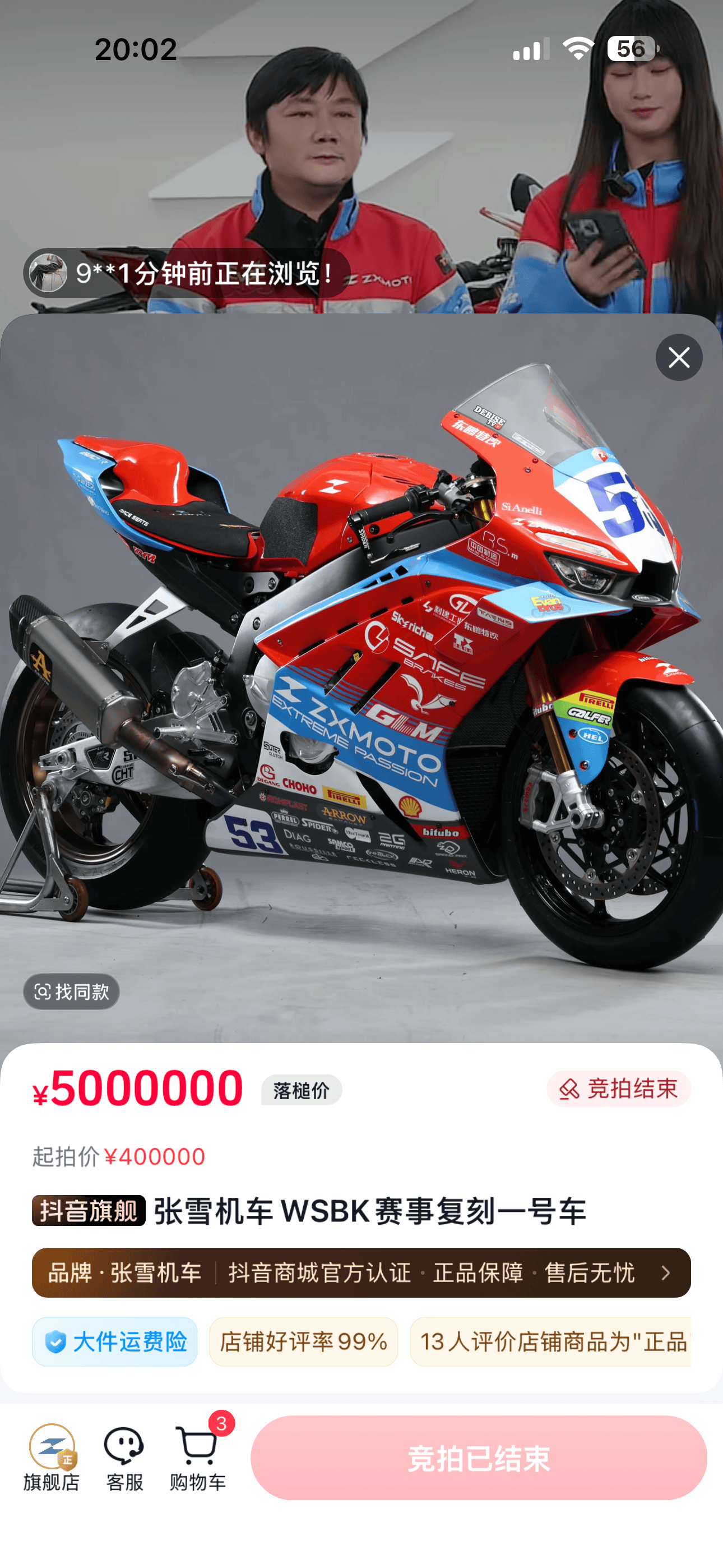 张雪拍卖会1分钟结束!500万卖出夺冠复刻赛车