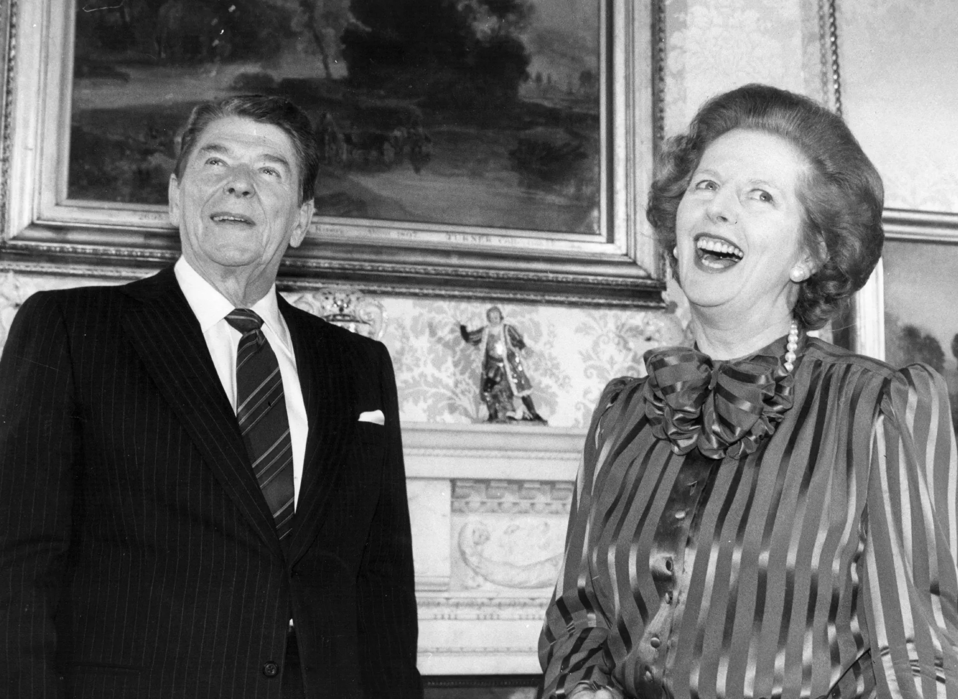 美国总统列根(Ronald Reagan)和英国首相戴卓尔夫人(Margaret Thatcher)。(Getty Images)