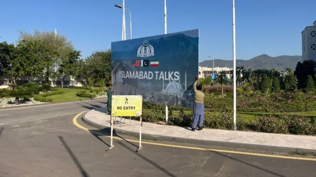 美伊和谈破裂,巴基斯坦人员早上在伊斯兰堡会场外拆除布景板。