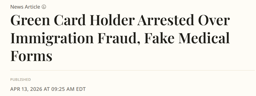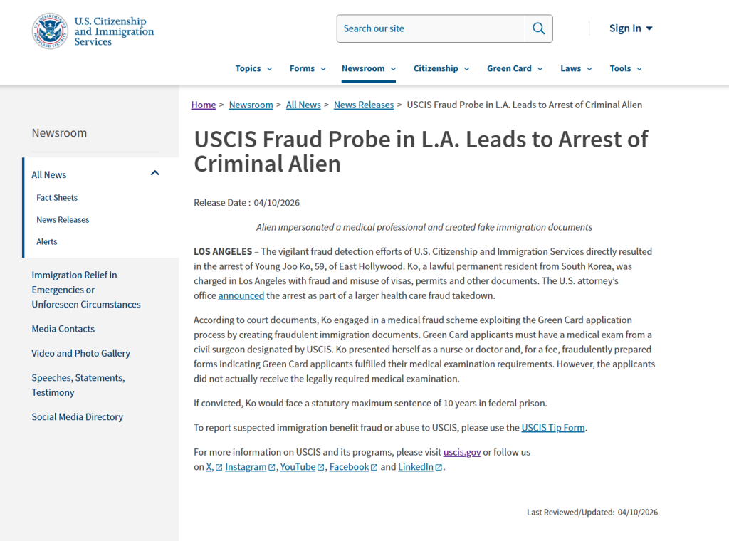 一名居住在洛杉矶(专题)的韩裔绿卡持有者,因涉嫌在移民(专题)申请过程中伪造医疗文件,被联邦当局逮捕并面临刑事指控。