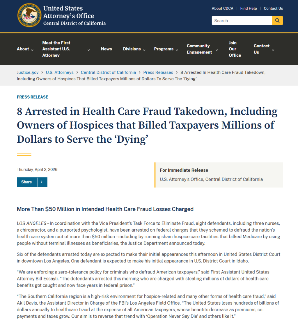 该案由多个联邦机构联合调查。执法部门表示,该案件属于南加州(专题)地区更大范围打击医疗及移民欺诈行动的一部分。