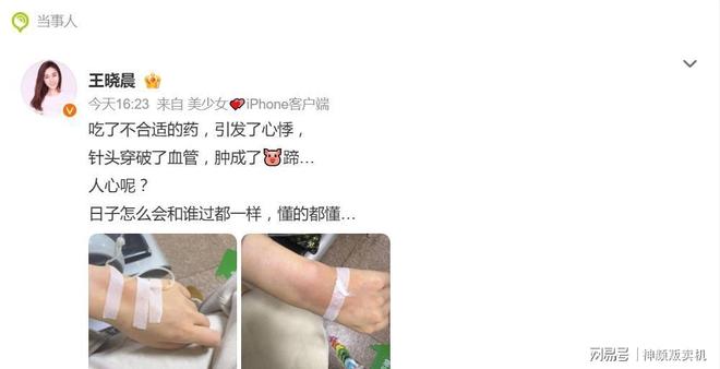 4月13日,王曉晨在個人微博詳細描述了這場突如其來的“連環劫”。起因是她服用了“不合適的藥”,直接引發了心悸,不得不緊急就醫。屋漏偏逢連夜雨,在醫院輸液治療時,又遭遇了醫療操作失誤——針頭穿破了血管,導致藥液外滲。從她曬出的情況看,手臂和手部因此出現了嚴重腫脹,她自己用“腫成了豬蹄”來形容,場面著實令人心疼。
