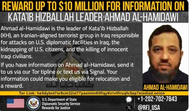 美国国务院的“正义奖赏计划”(Rewards for Justice,RFJ)周二(14日)悬赏高达1000万美元,并收集有关艾哈迈德·哈米达维(Ahmad al-Hamidawi)的资讯。