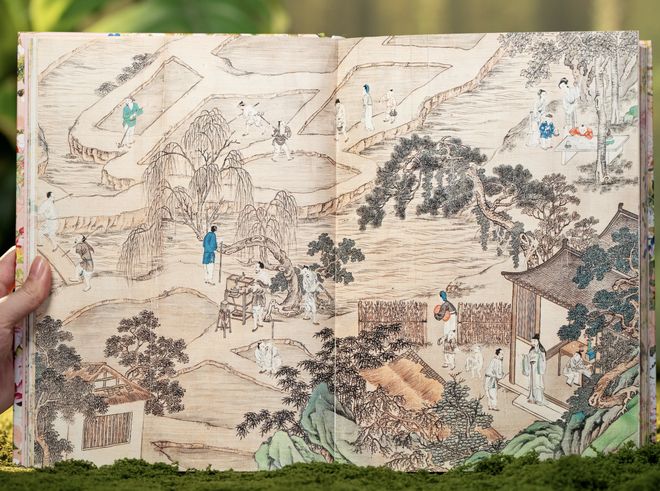 更绝的是书口三面刷边,上下两册并排,就是一幅完整的工笔长卷。