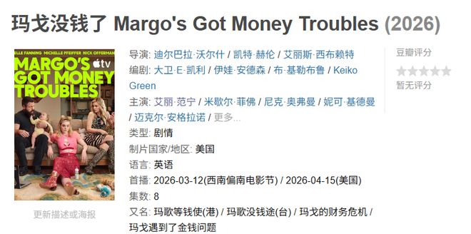 艾丽·范宁主演的新剧《玛戈没钱了》已正式开播。该剧讲述了一位单亲妈妈的故事,不仅剧集质量上乘,在烂番茄上也收获了极佳的媒体口碑。女主角艾丽·范宁更是奉献了演艺生涯中尺度最大的一次表演,感兴趣的朋友不容错过。