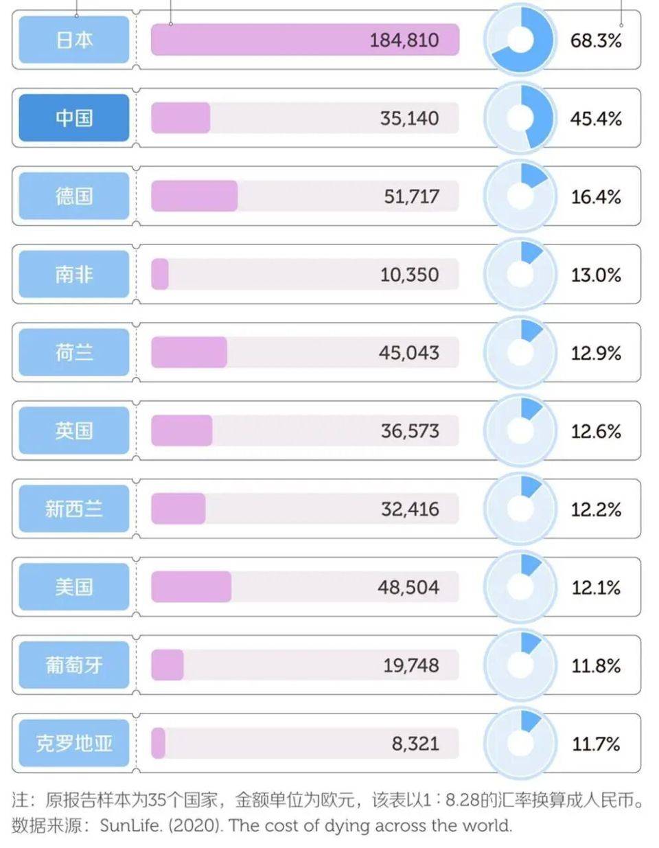 據英國人壽保險機構SunLife 2020年調查顯示: 中國平均殯葬費用約占年平均工資的45.4%,僅次於日本(专题)的68%,位居全球第贰。