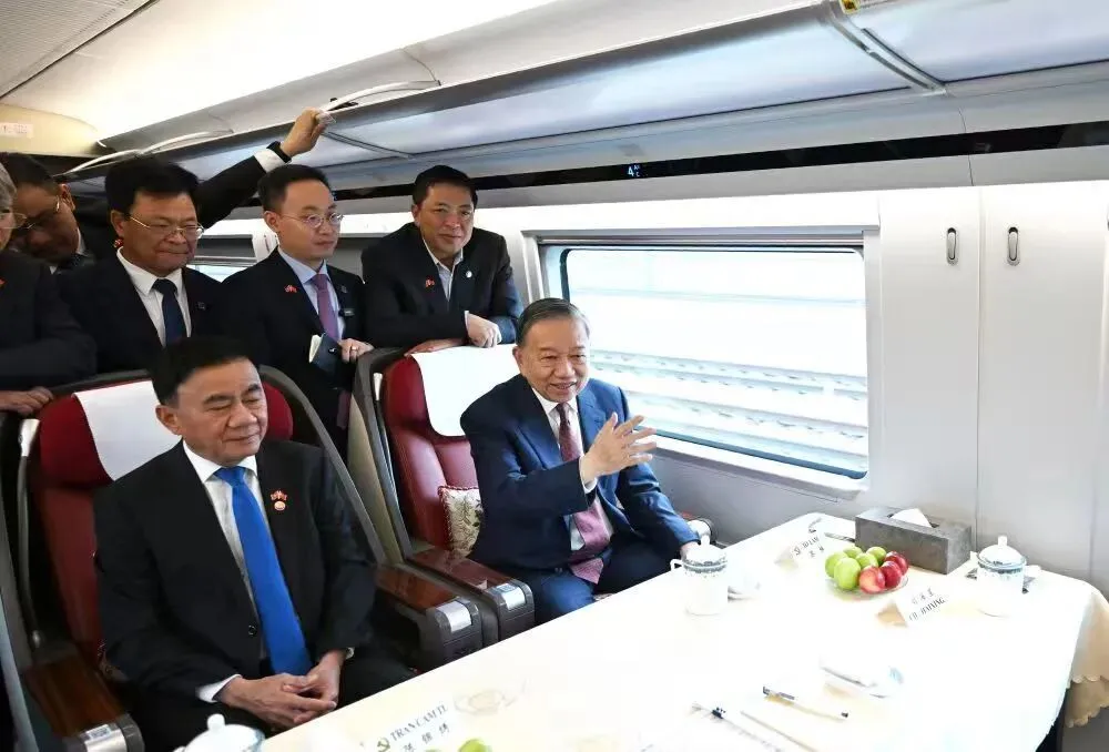 4月16日上午9时,越共中央总书记、国家主席苏林登上“复兴号”高铁,从北京启程前往广西。2400公里、10小时的高铁旅程,苏林眺望“从北到南”的中国风光,与同排就座的越共中央书记处常务书记陈锦绣谈笑,还专门前往车头,近距离观摩了解驾驶操作流程。