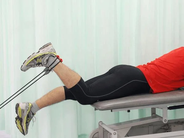 俯臥在瑜伽墊上,雙腿自然伸直,腳尖繃直;雙臂可自然放於身體兩側,或雙手交叉墊在額頭下方,保持上半身穩定不晃動。取壹根彈力帶,將壹端固定在身前的穩定物體上(比如床腿、訓練架、沉重的家具腿),固定高度與腳踝平齊或略低;然後將彈力帶的另壹端套在單側腳踝上方。注意,彈力帶需要處於輕微繃緊的狀態。